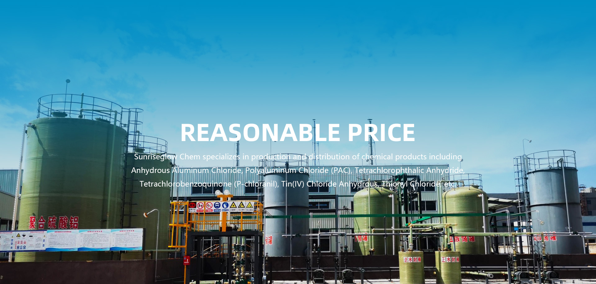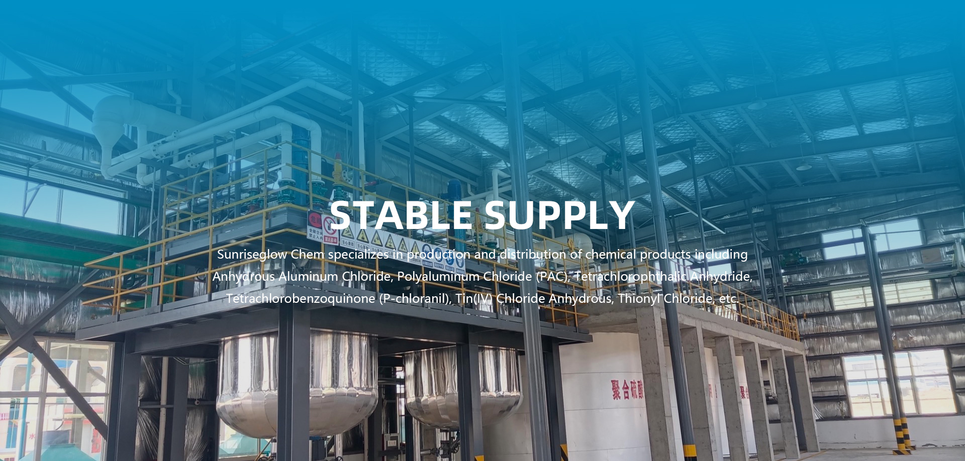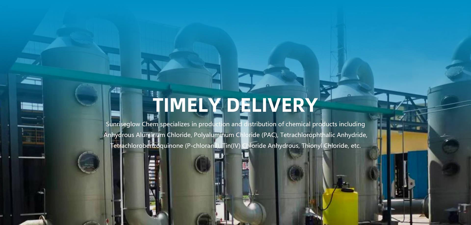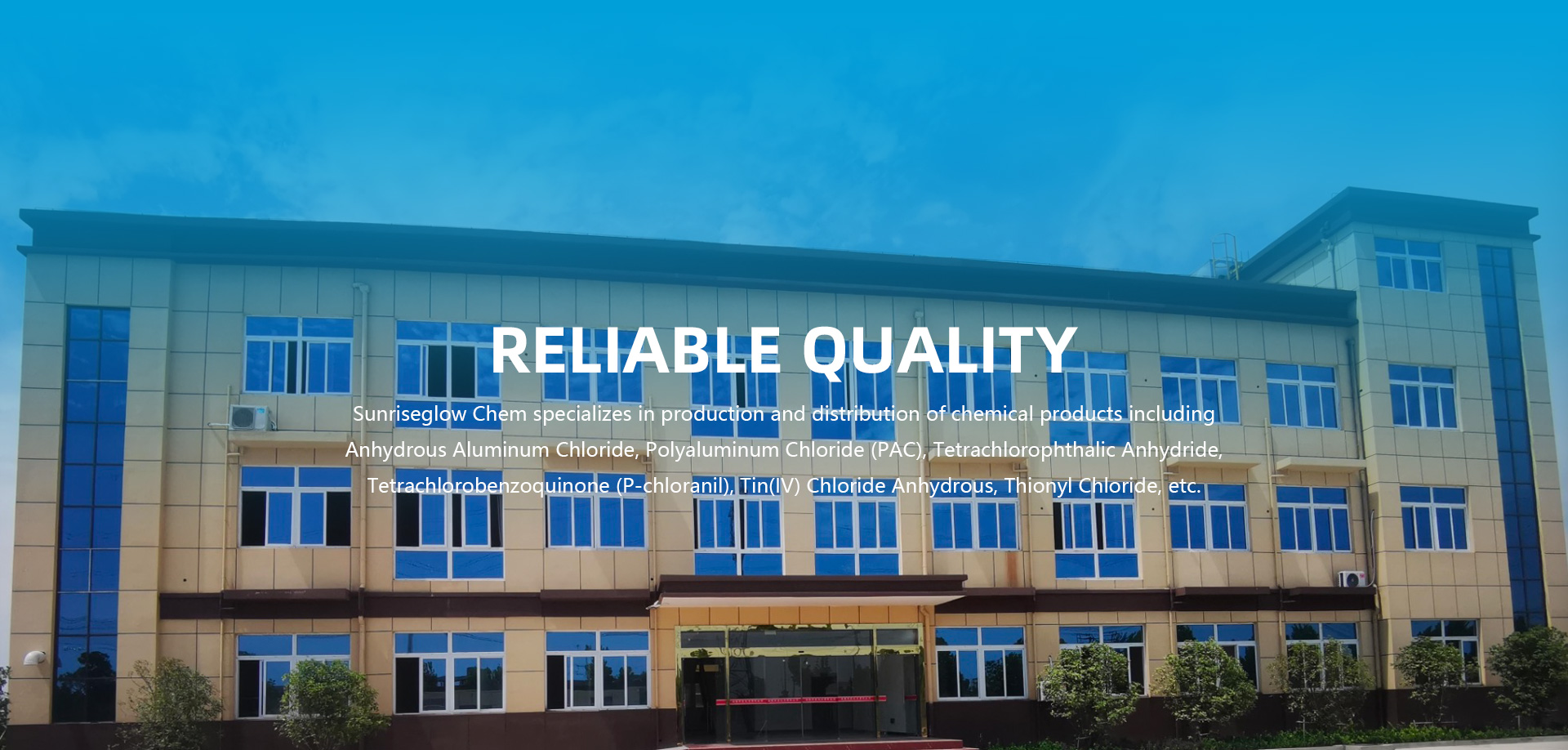Sunriseglow Chem specializes in production and distribution of chemical products including Anhydrous Aluminum Chloride, Polyaluminum Chloride (PAC), Tetrachlorophthalic Anhydride, Tetrachlorobenzoquinone (P-chloranil), Tin(IV) Chloride Anhydrous, Thionyl Chloride, etc.